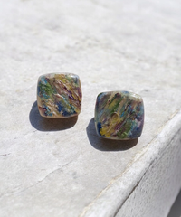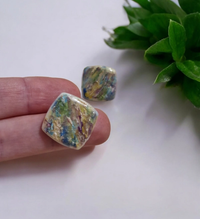 Ručno rađene naušnice u obliku kvadrata, oslikane prekrasnim, živim bojama koje se nježno stapaju jedna u drugu. Svaka naušnica je jedinstvena, a čelične iglice od nehrđajućeg čelika osiguravaju ugodno i sigurno nošenje tijekom cijelog dana. Lagane i upečatljive, savršene su za dodavanje boje i karaktera svakom outfitu.