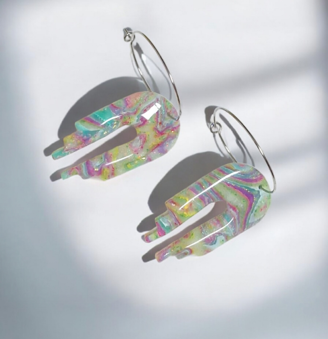 Ručno rađene naušnice od polimerne gline, s naglaskom na razigrane, žive boje i fluidni uzorak inspiriran igrom polarne svjetlosti. Lagane i ugodne za nošenje, s čeličnim krugom koji savršeno balansira njihov umjetnički karakter. Idealne za sve koji vole upečatljive, a profinjene modne dodatke, lako uklopive u svakodnevne i posebne kombinacije.