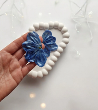 Ručno rađene cvjetne naušnice od polimerne gline, pažljivo oblikovane kako bi svaka latica savršeno pristajala u skladnu cjelinu. Suptilne nijanse plave boje, upotpunjene metalik listićima u istoj paleti, daju naušnicama profinjen i glamurozan izgled. Unatoč svojoj veličini, iznimno su lagane i ugodne za nošenje tijekom cijelog dana. Naušnice dolaze na iglici od nehrđajućeg čelika, prikladnoj i za osjetljivu kožu.