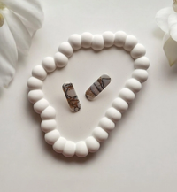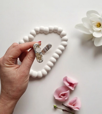 Naušnice od polimerne gline mramornog dizajna u kombinaciji bijele i crne boje, upotpunjene zlatnim listićima za dašak glamura. Svaka naušnica ima svoju priču i nijedna nema isti uzorak, što ih čini uistinu jedinstvenima. Dodatno su premazane zaštitnim slojem za lijep sjaj, a dolaze na iglici od čelika, prikladnoj za ugodno nošenje.