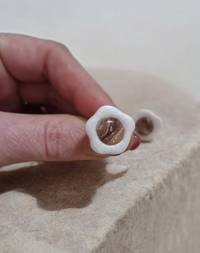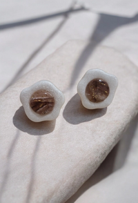 Ručno rađene naušnice od polimerne gline u toplim smeđim tonovima i bijelim obrubom. Naušnice dolaze na čeličnim iglicama koje osiguravaju ugodno i sigurno nošenje tijekom cijelog dana. Lagane su i posebne, savršene za svakodnevne prilike.