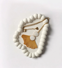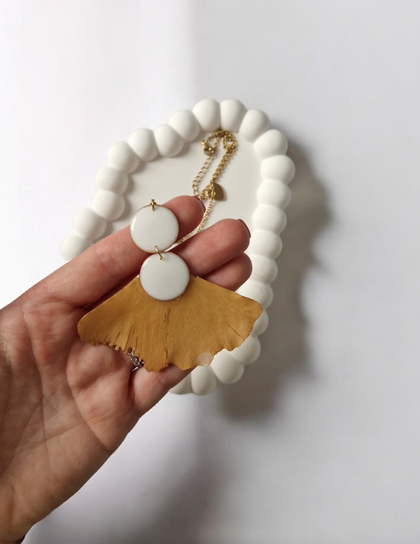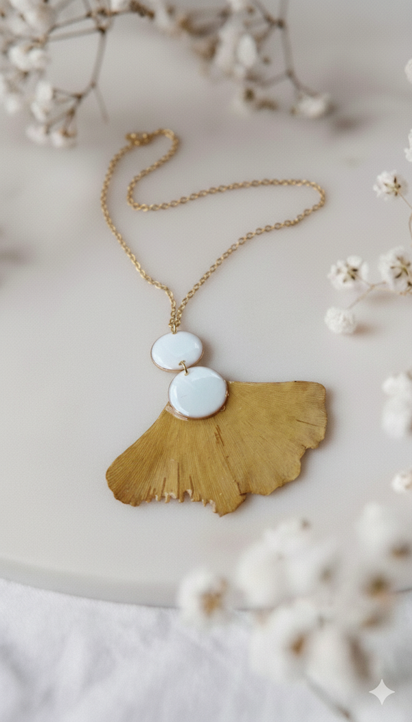 Ogrlica izrađena od sušenog ginka, pažljivo premazanog smolom kako bi se osigurala dugotrajnost i očuvala prirodna ljepota ovog krhkog lista. Dva bijela kruga skladno nadopunjuju dizajn i daju ogrlici elegantan, moderan izgled.