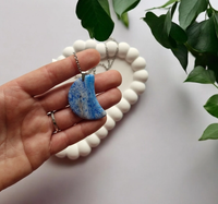 Ručno oblikovana ogrlica od polimerne gline u obliku polumjeseca, u nježnim plavim nijansama, ukrašena detaljima srebrnih listića koji joj daju profinjen i elegantan karakter. Završni premaz od smole osigurava dodatni sjaj i dugotrajnost. Lančić duljine 45–50 cm dolazi s mogućnošću produljenja, što omogućuje savršeno pristajanje za svaku priliku.