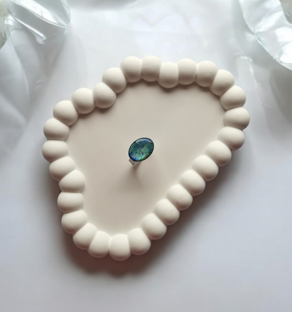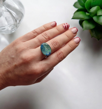 Prsten od polimerne gline u prošaranim nijansama plave i zelene boje, koje se nježno prelijevaju jedna u drugu, sa suptilnim šljokastim sjajem koji podsjeća na blistavi odsjaj mora plave lagune. Metalni dio prstena izrađen je od čelika i podesiv je za različite veličine, što ga čini udobnim i praktičnim za nošenje. Elegantan i svestran, ovaj prsten savršen je detalj za svaki outfit.